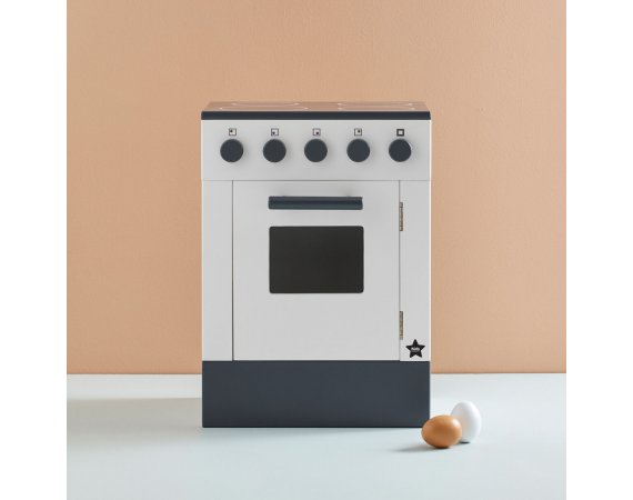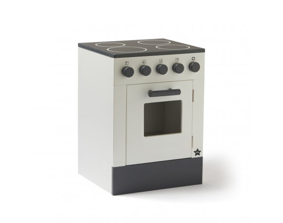 Fin vit spis i klassisk stilSpisen har fyra hällar och alla knappar har klickljud och kan vridas. Spisen har en ugn med bakplåt. Eftersom Kid's Concept vill undvika plast i sina produkter har ugnsluckan inget fönster.