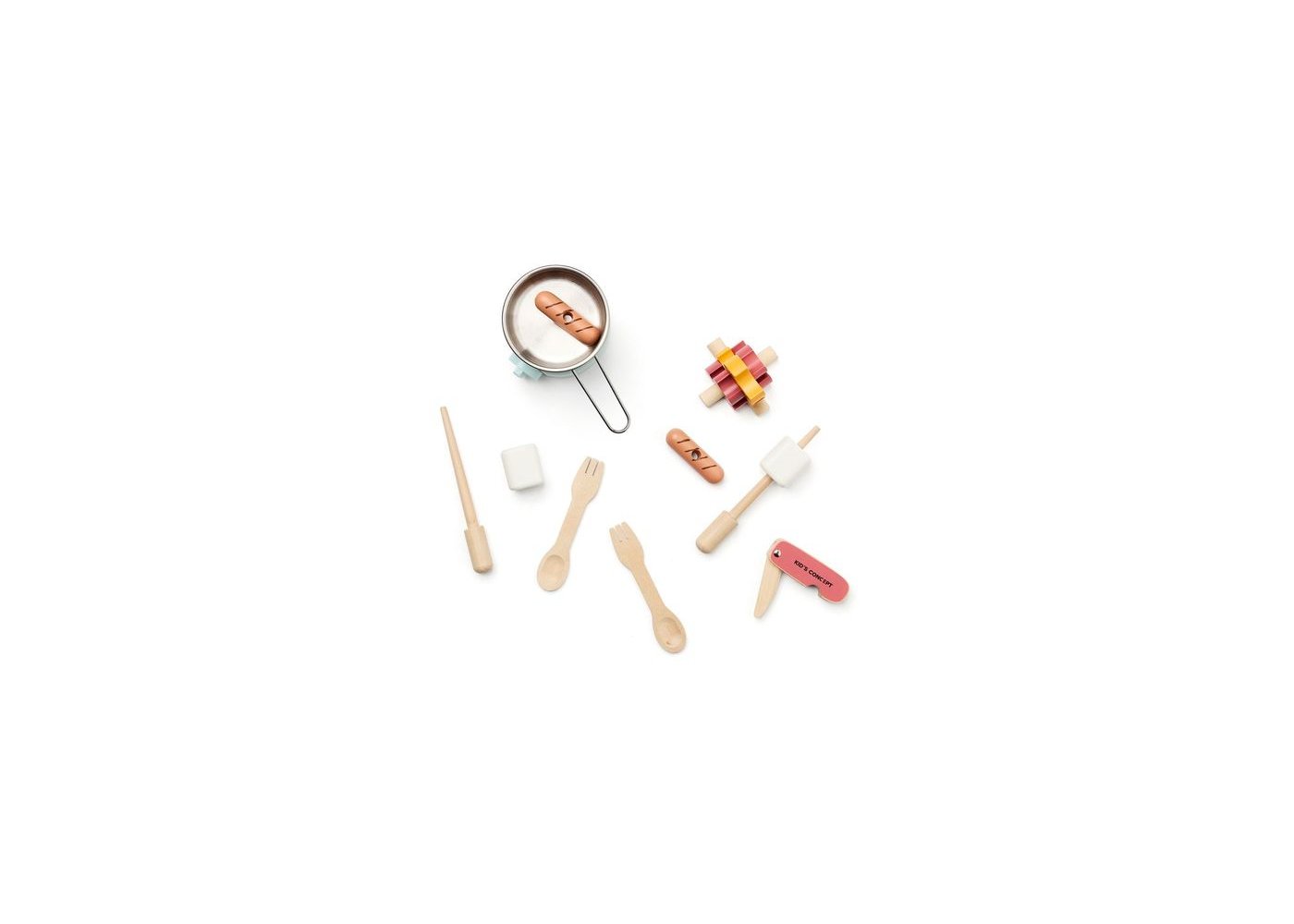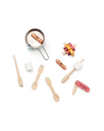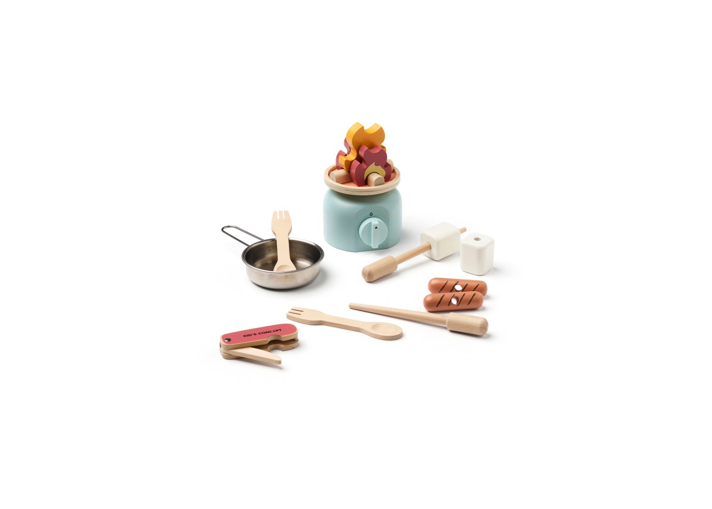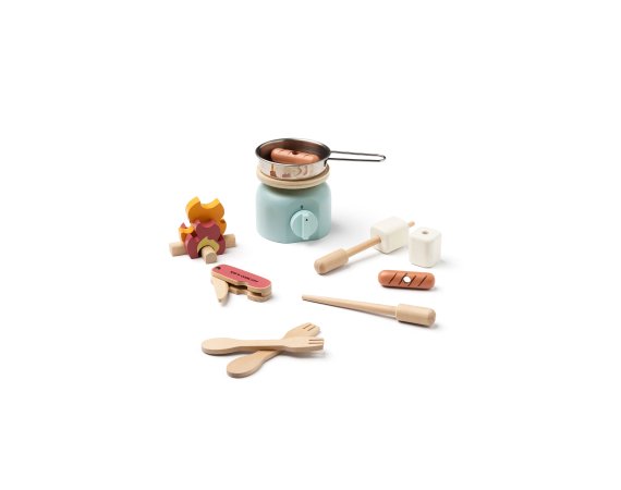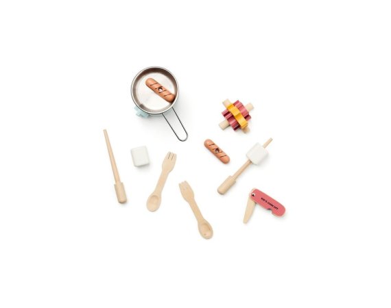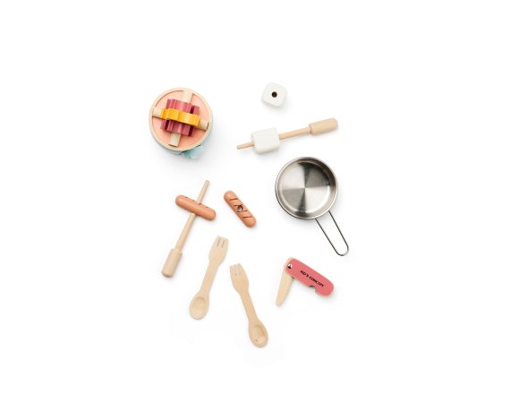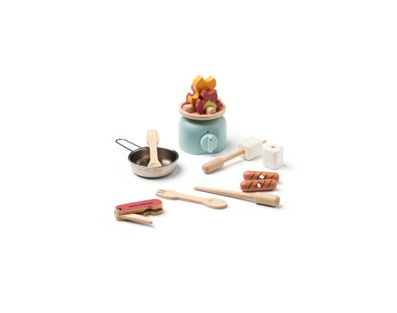 Roligt campingkökssats för den lilla äventyraren. Satsen består av en spis med härliga tillbehör. Du får både "eld", marshmallows på spett att grilla över elden, en stekpanna, två korvar, en kniv och två sporks (kombinerad sked och gaffel). Allt som behövs för den perfekta campingresan.
