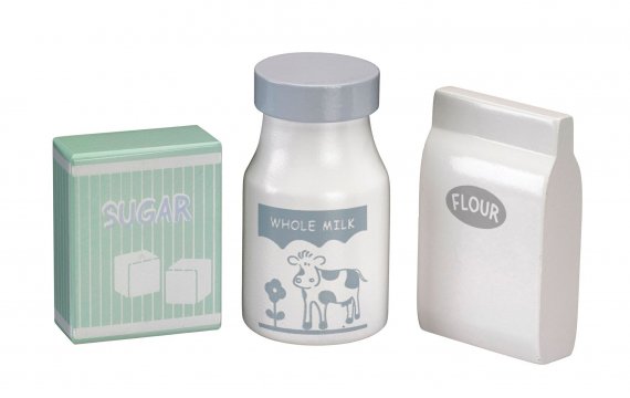 Setet består av 6 delar: en mixer, en skål, ägg, mjöl, mjölk och socker.