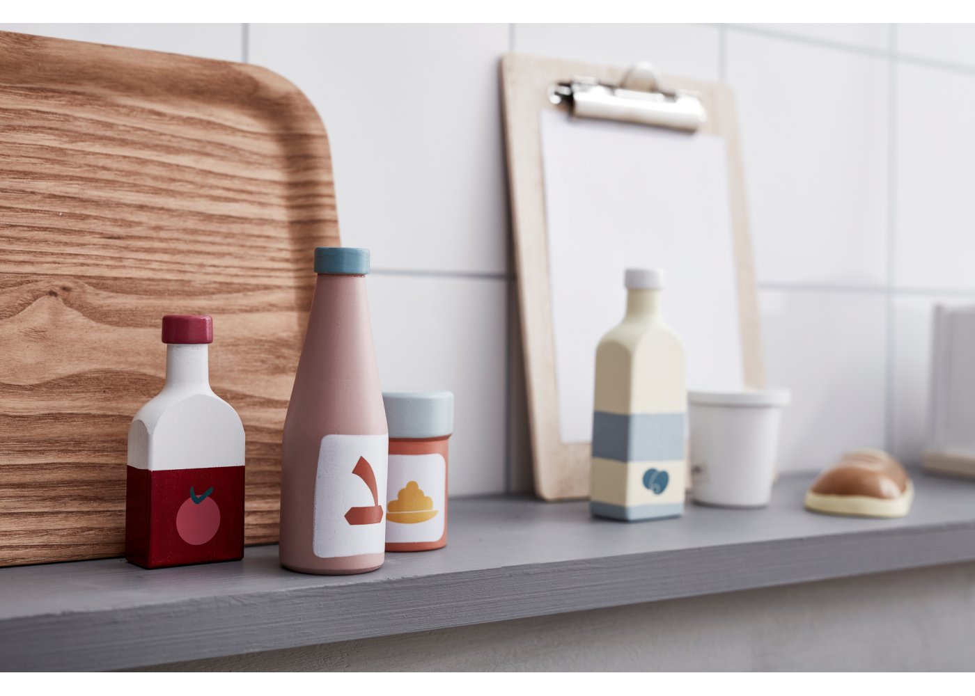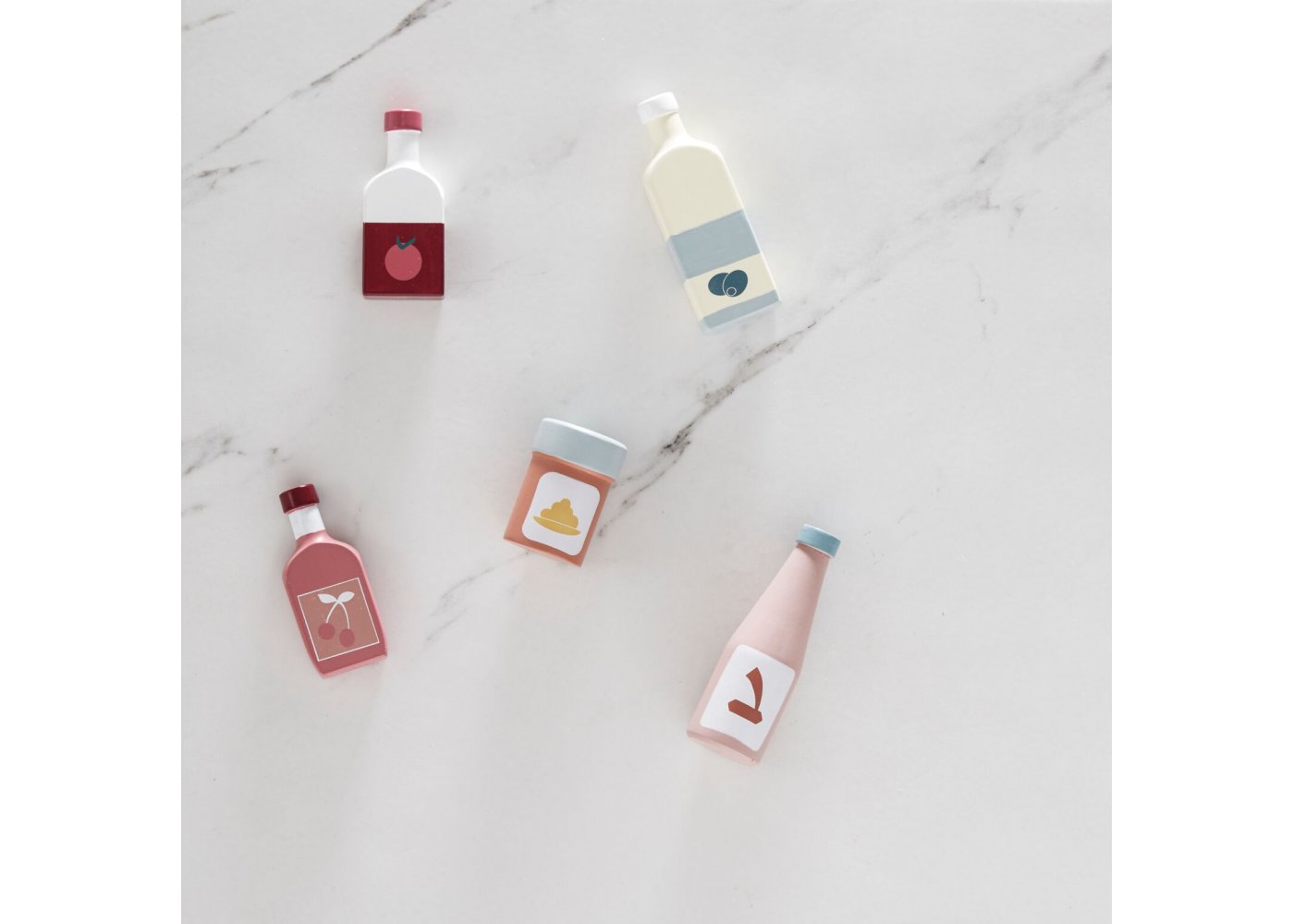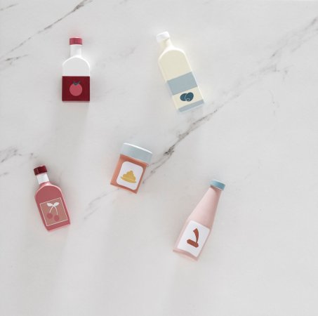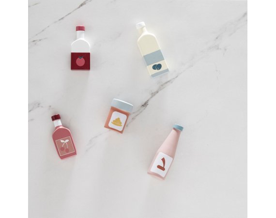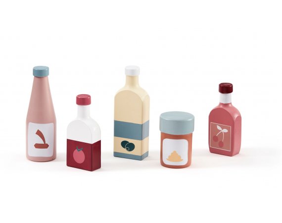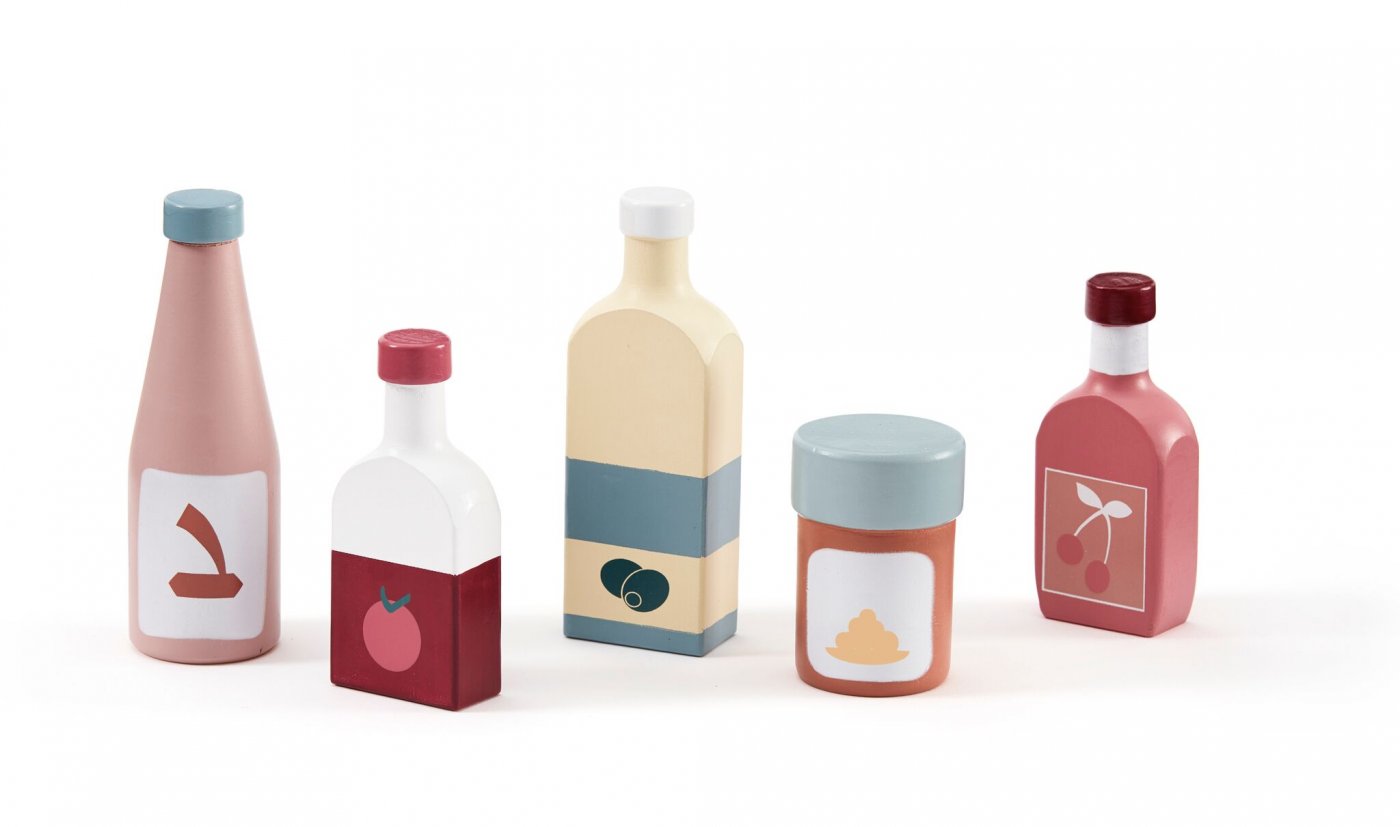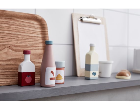 Flaskset i trä från Kid's ConceptSetet består av 5 flaskor i trä med utsökt olivolja, tomatjuice, sojasås, körsbärslemonad och senap.