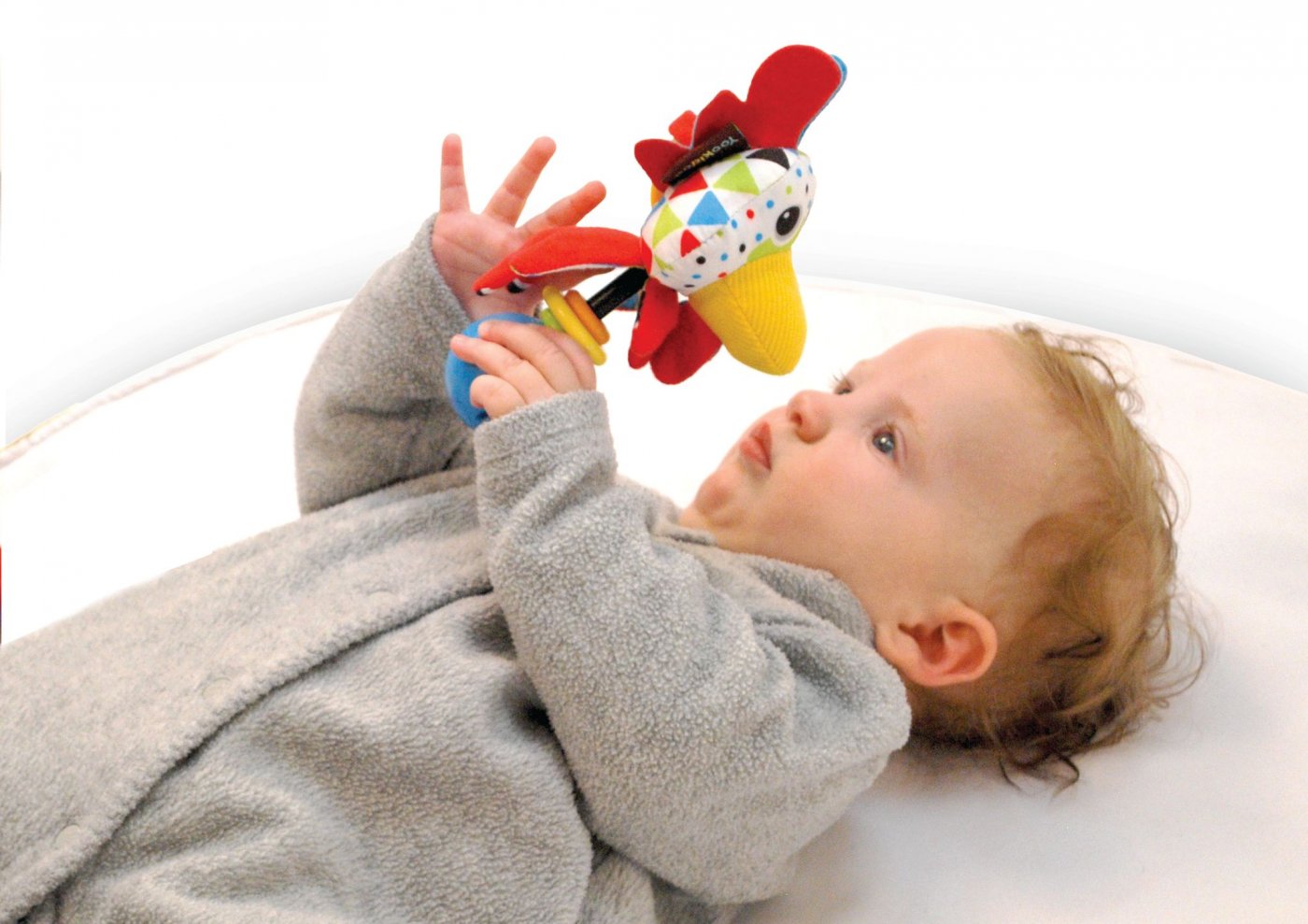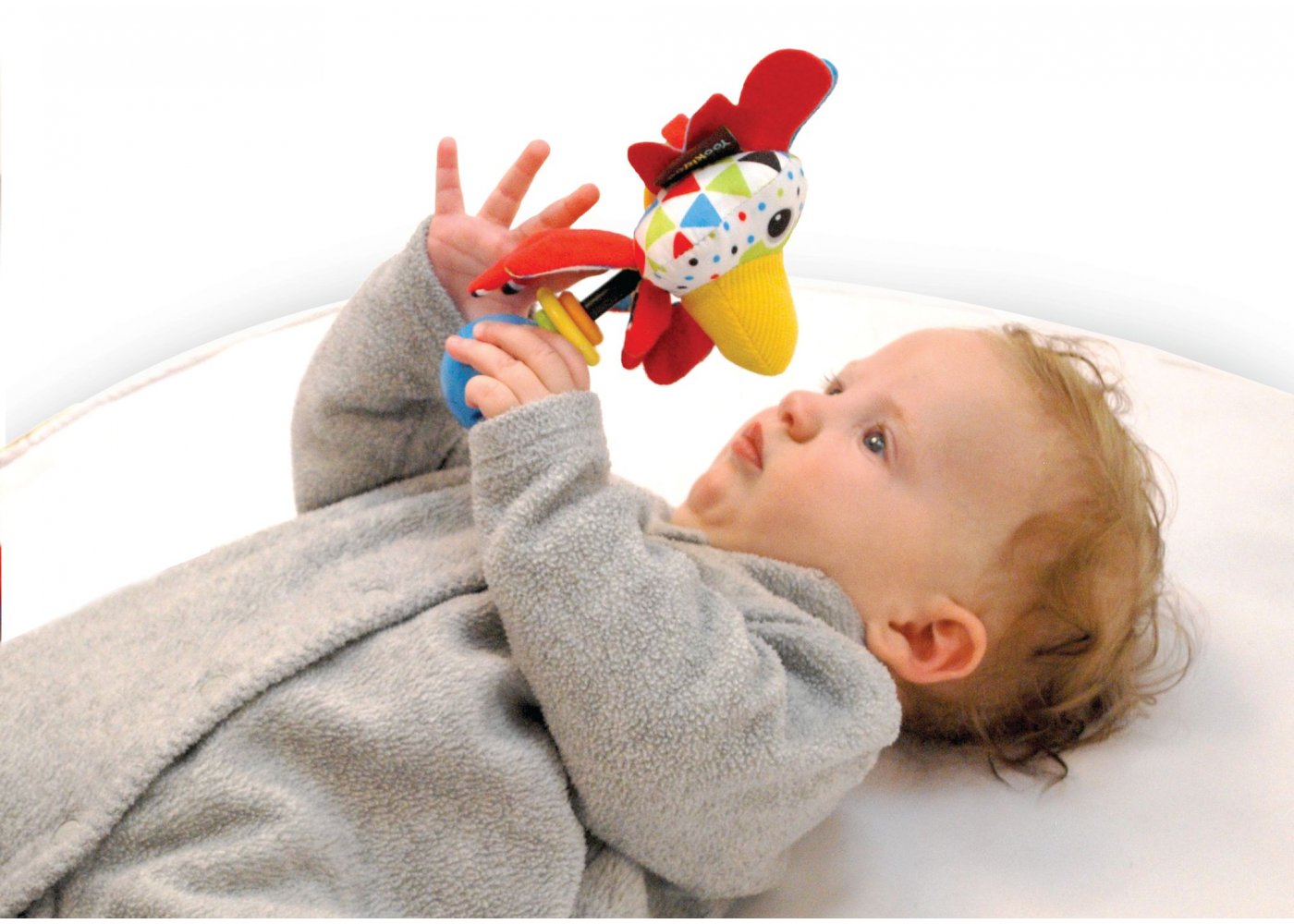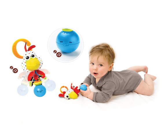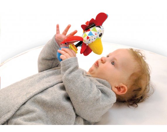 Söt skallra med roligt tupp-motiv designat för små händer.Skallran är tillverkad av mjuka textilier i olika material och har knastrande öron.