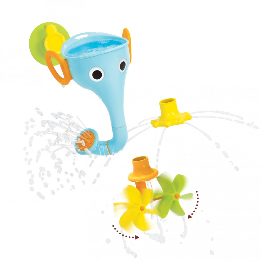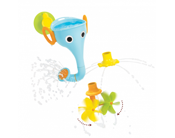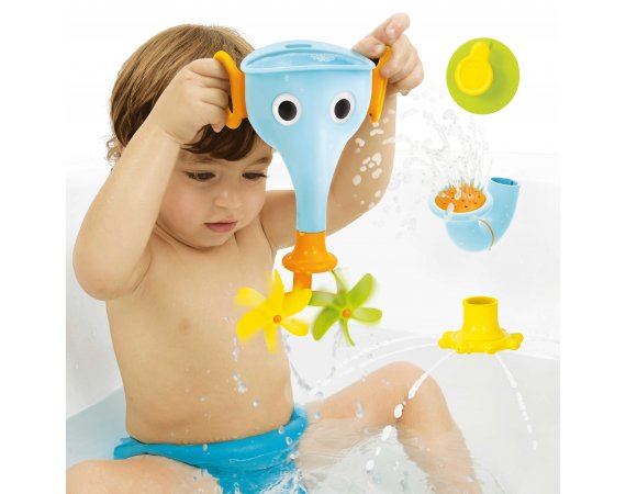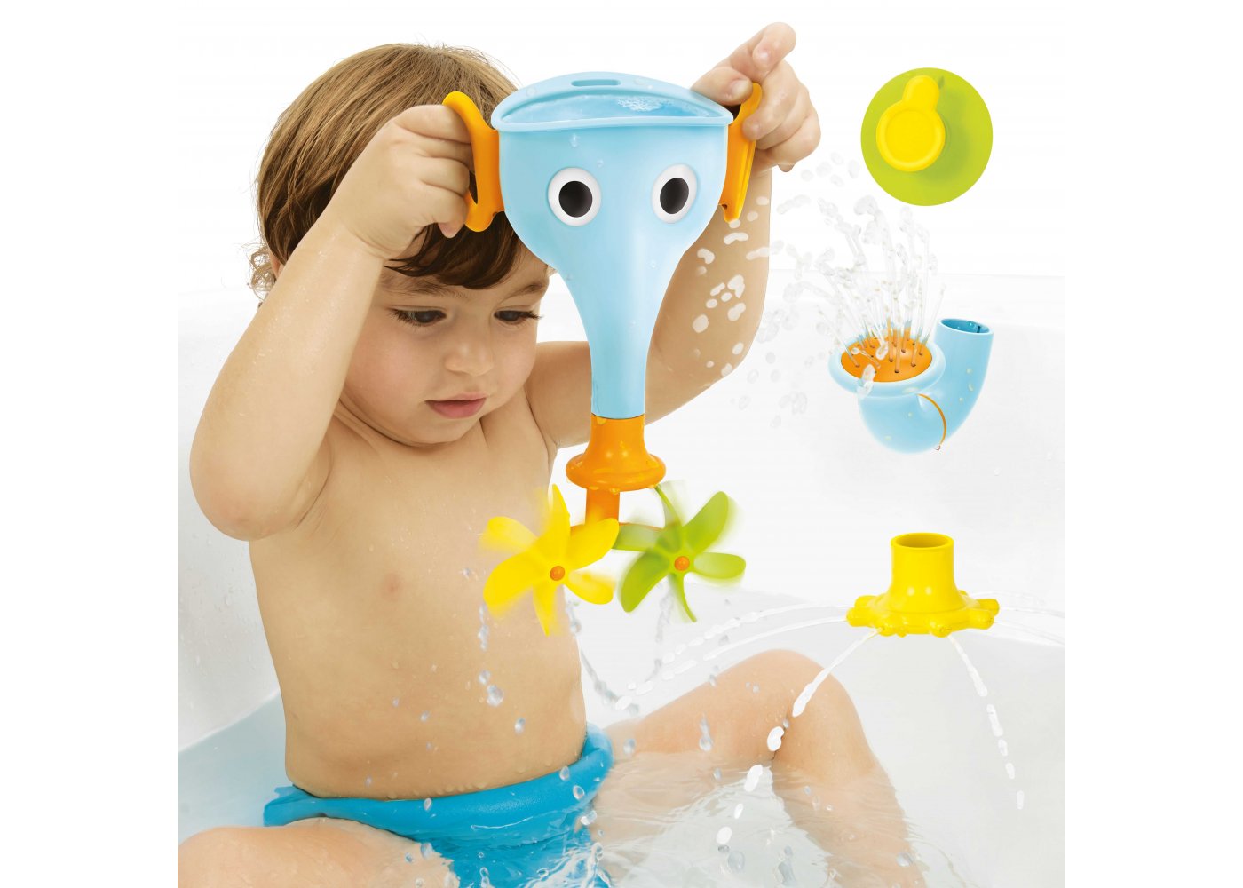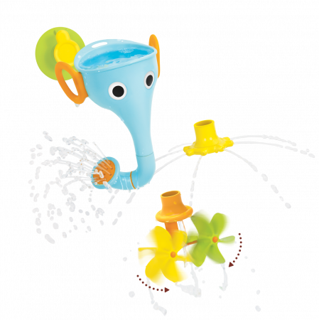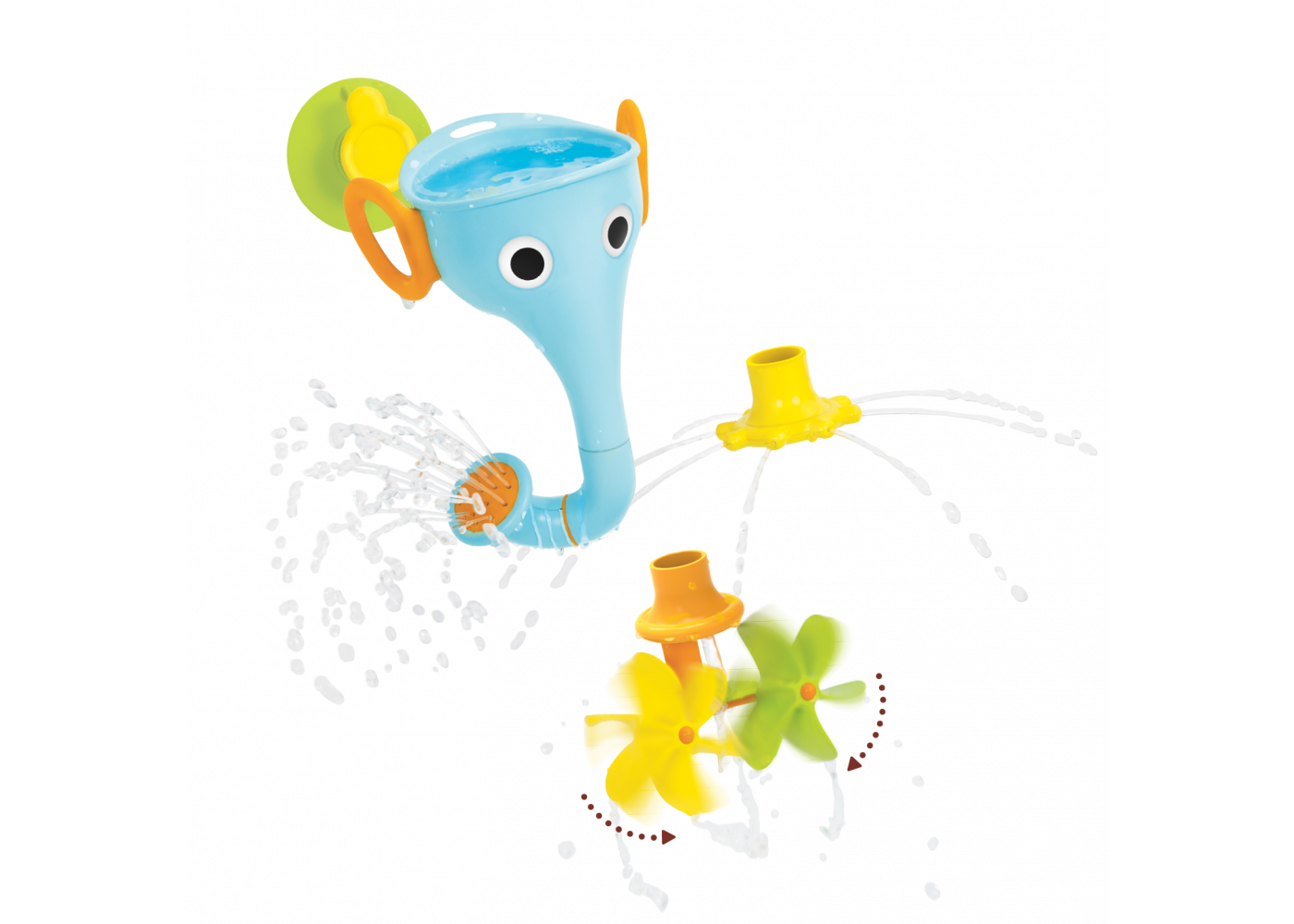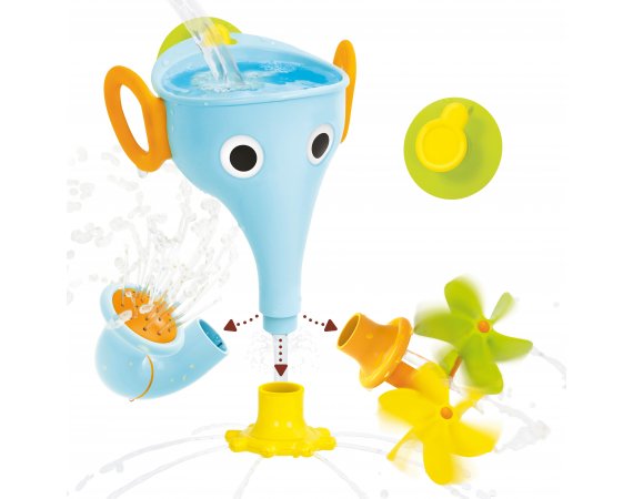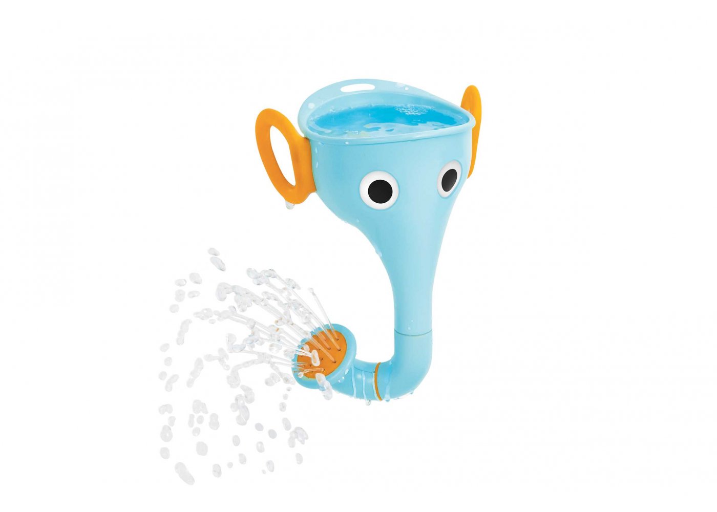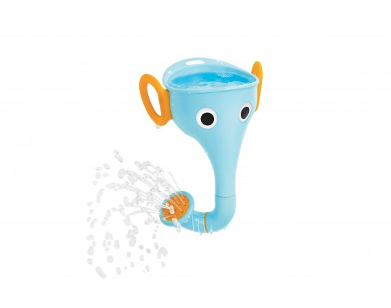 Söt Yookidoo elefantbadleksak, blå.Elefanten fästs på badkaret eller väggen med en sugkopp. Setet levereras med tre utbytbara delar för att sätta på elefantens snabel - ett duschhuvud, ett munstycke och ett kugghjul. Elefanten kan tas av hållaren och fyllas med vatten direkt från badkaret. Allt som allt ett bra sätt och hjälp att göra de små trygga och glada i badsituationen. Efter användning kan alla delar placeras i elefanttratten och förvaras till nästa gång.