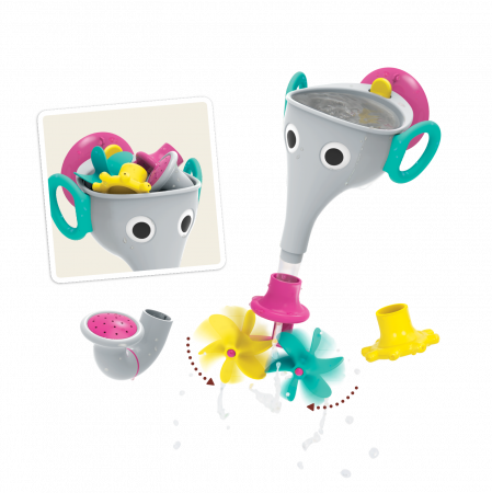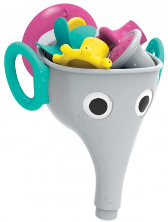 Söt Yookidoo elefantbadleksak, grå.Elefanten fästs på badkaret eller väggen med en sugkopp. Setet levereras med tre utbytbara delar för att sätta på elefantens snabel - ett duschhuvud, ett munstycke och ett kugghjul. Elefanten kan tas av hållaren och fyllas med vatten direkt från badkaret. Allt som allt ett bra sätt och hjälp att göra de små trygga och glada i badsituationen. Efter användning kan alla delar placeras i elefanttratten och förvaras till nästa gång.