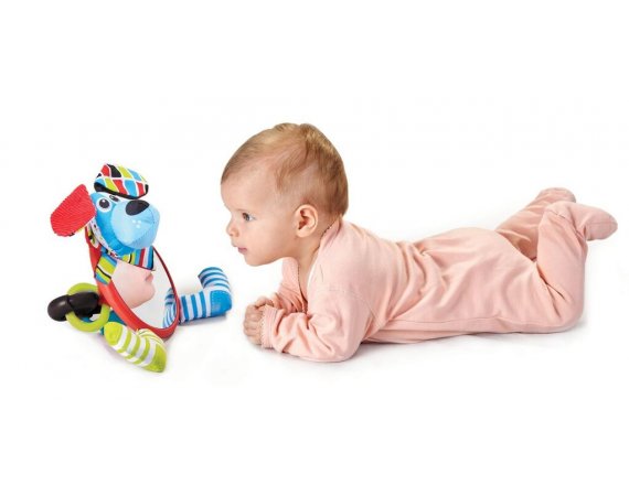 Placera spegeln upprätt på golvet och placera din baby framför den. Ett bra sätt att öva barnets motoriska färdigheter. Det stärker axlarna och överkroppen och främjar barnets förmåga att lyfta huvudet.