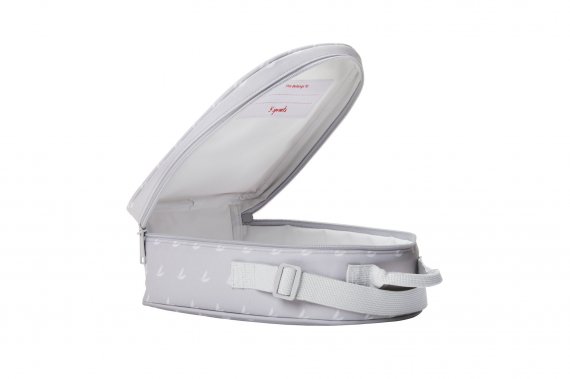 Den stängs med blixtlås, och har ett stort fack som rymmer dagens måltider. Axelväskan har namnbricka, handtag och en lång justerbar rem så att den kan bäras över axeln eller ryggen till och från dagis, institution eller skola. Ett praktiskt sätt att hålla händerna fria på. Axelväskan har ett nät på sidan med plats till drickflaskan. Om olyckan är framme och det spills, så misströsta inte, eftersom väskans insida är lätt att torka av.