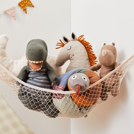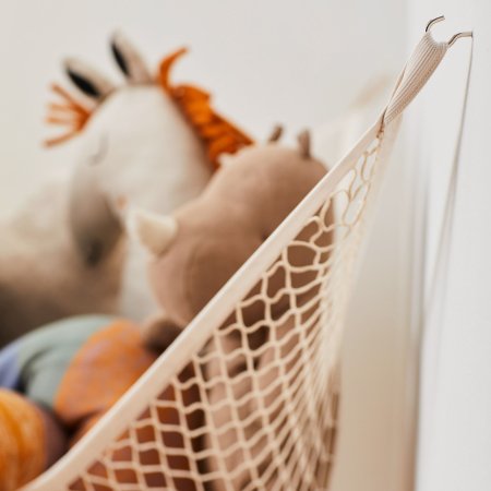 Hängmattan är perfekt för förvaring av gosedjur, leksaker, kläder och till och med sportutrustning, vilket gör den till en oumbärlig lösning för att behålla ordning och organisering i barnrummet. Den är designad för att passa in i vilket hörn som helst av rummet, vilket maximerar utrymmet och säkerställer en vacker inredning.