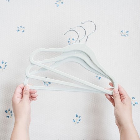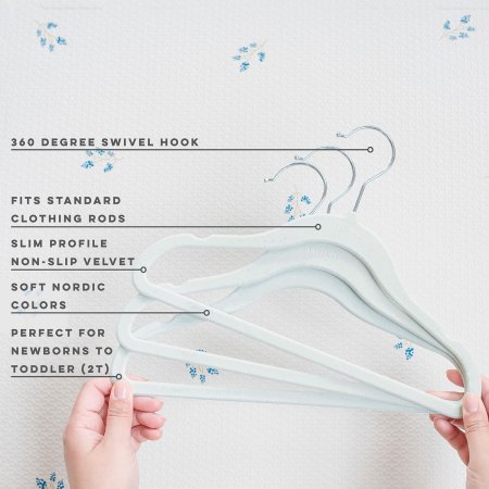 Här får du 15 stycken läckra sammetsgalgar i blått för att hänga upp ditt barns kläder.