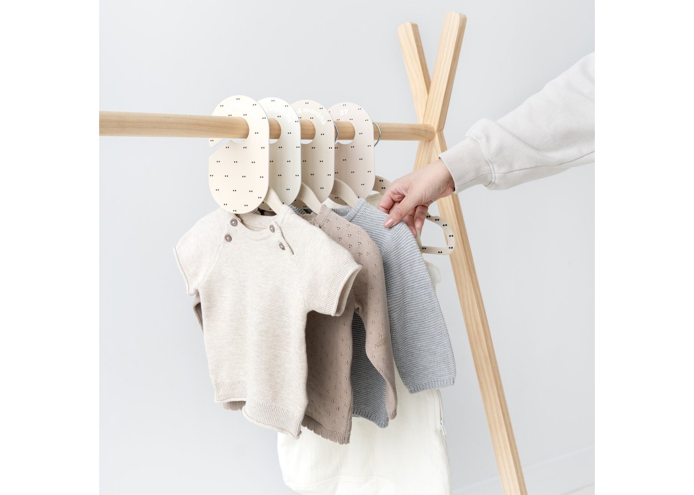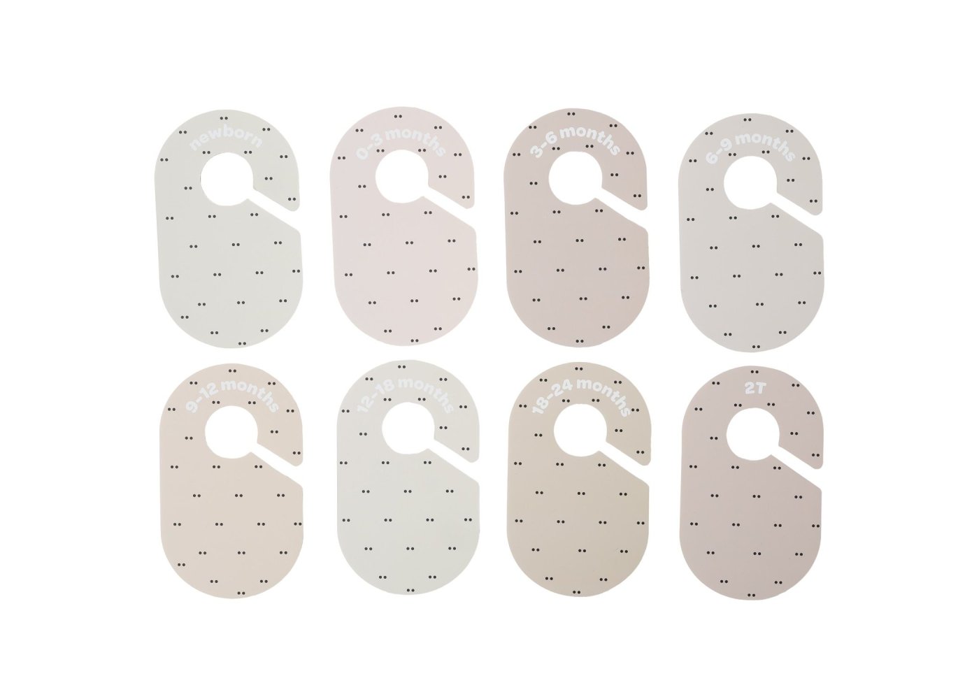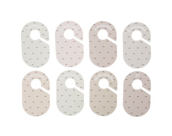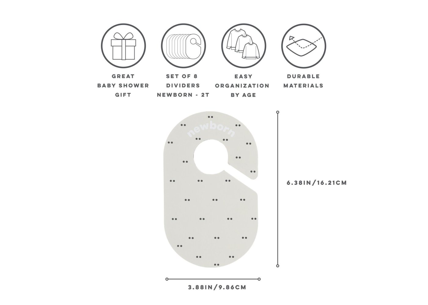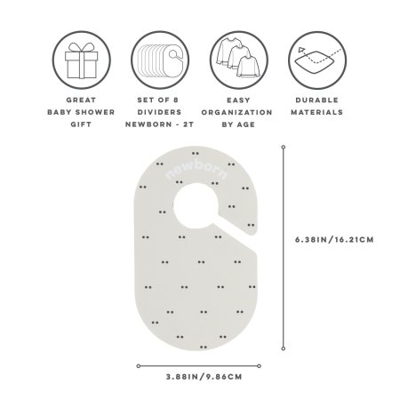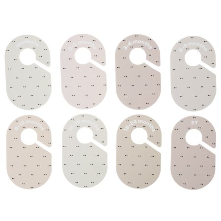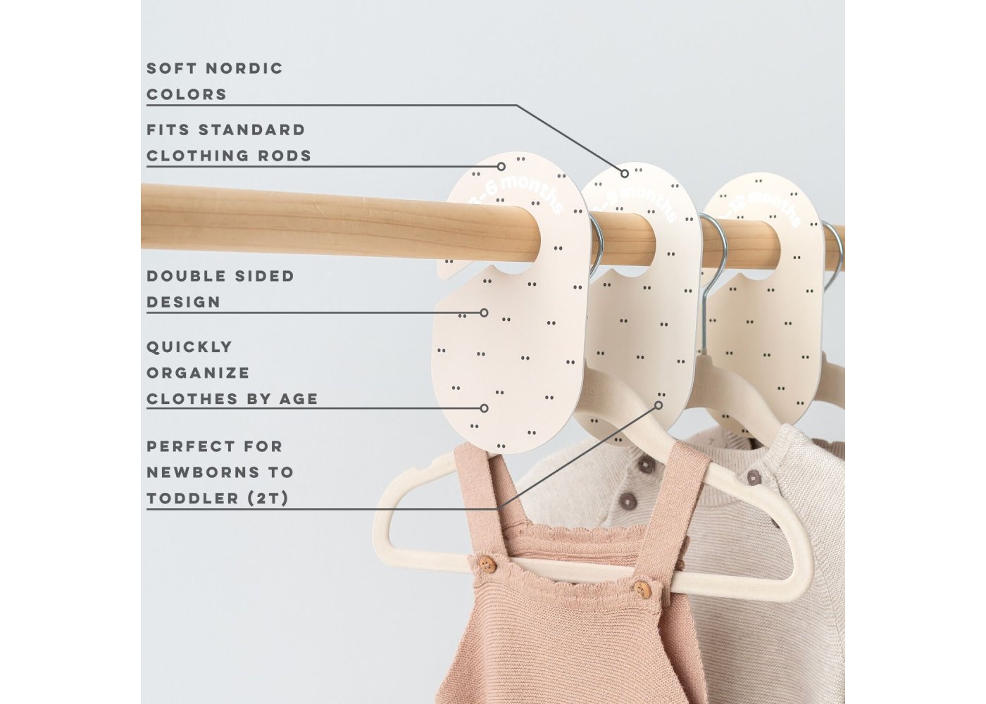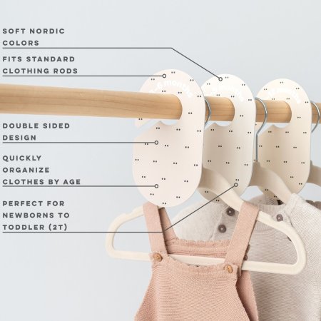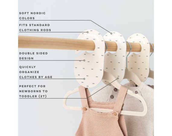 Nu blir det mycket lättare att sortera både nya kläder och de begagnade kläderna du har haft turen att ärva från en god vän. Garderobsdelarna passar standard galgstänger och trådhyllor. De har alla tryck med åldersangivelser på båda sidor, vilket gör det enklare än någonsin att förvara, organisera och snabbt hitta ditt barns kläder!