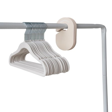 Galgen har velourfinish med en halkfri yta och små försänkningar för remmar, vilket säkerställer att kläderna sitter säkert på galgen utan att falla av.