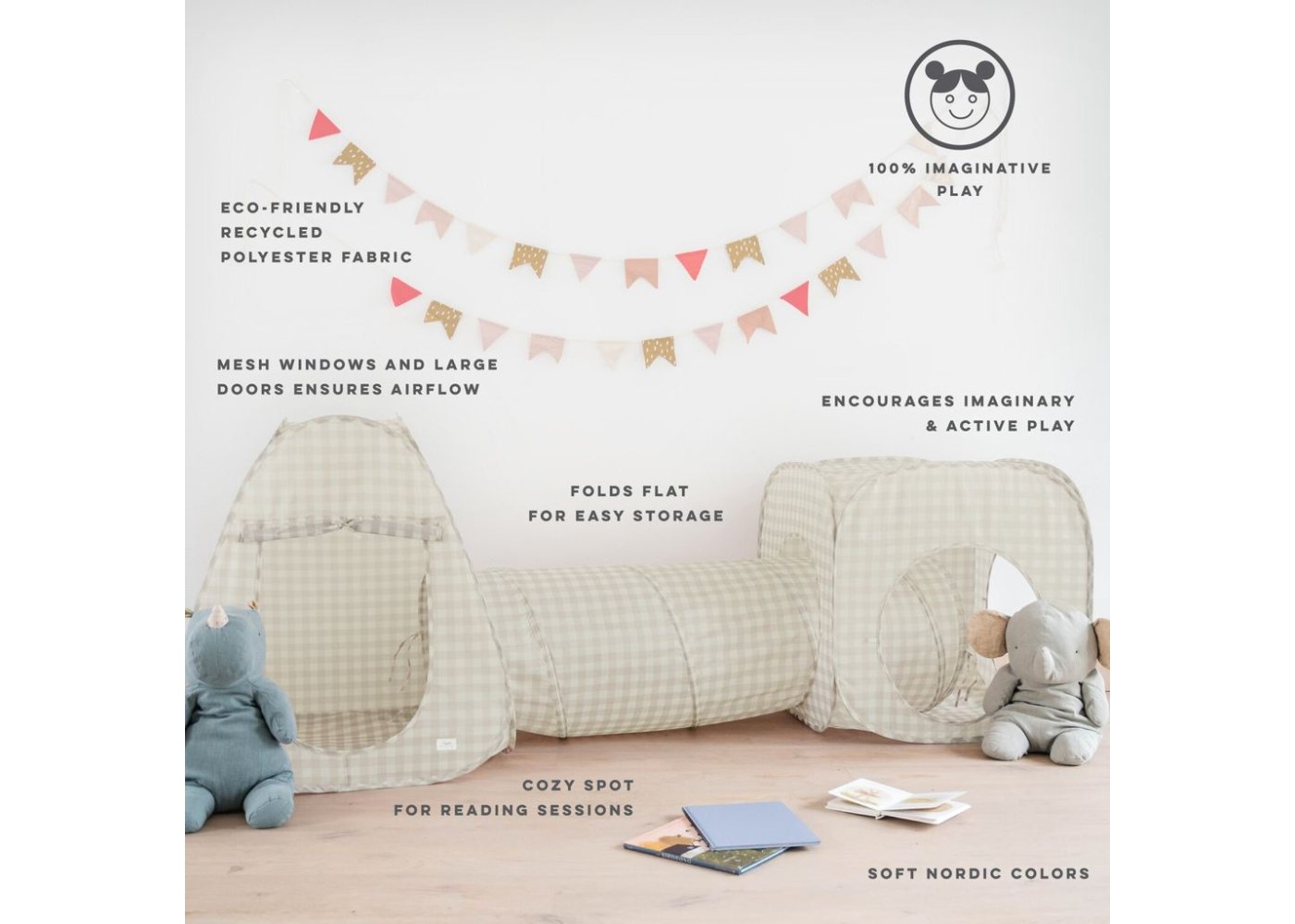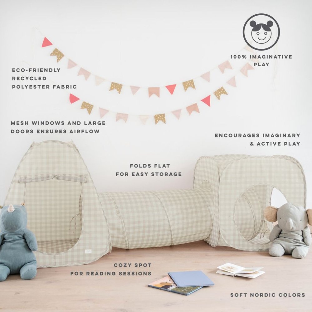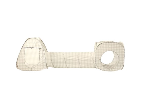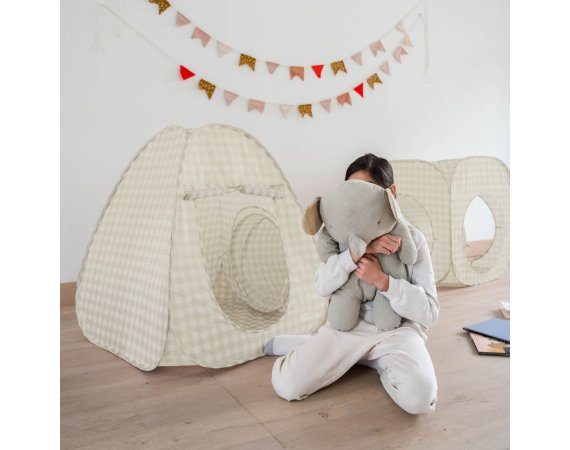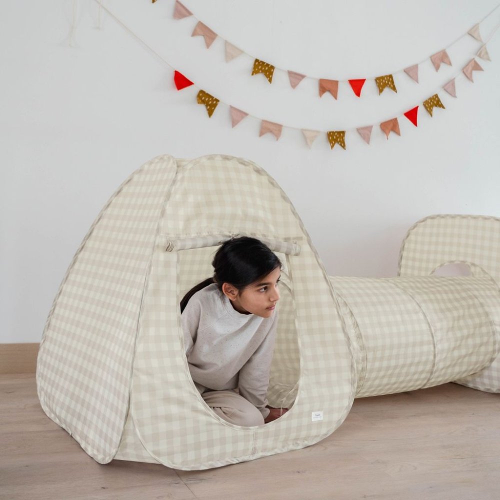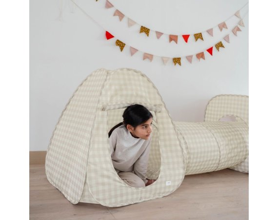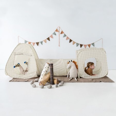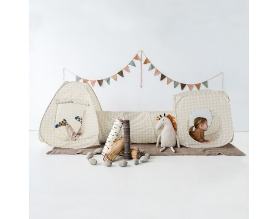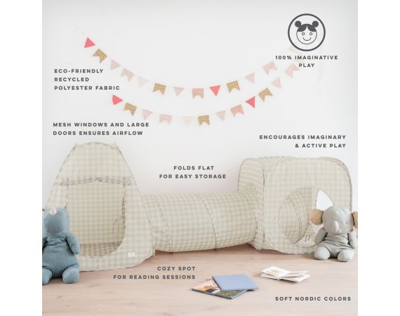 Här kan barnen bygga sin egen lilla grotta, krypa genom tunneln och gömma sig i de två tälten.