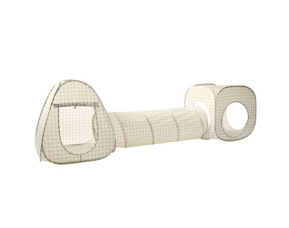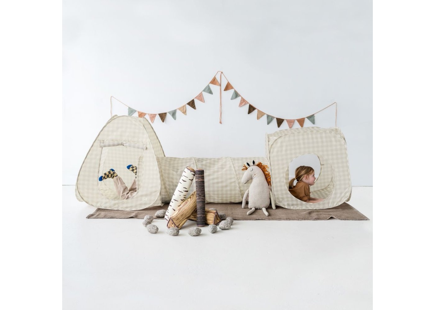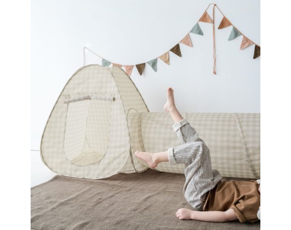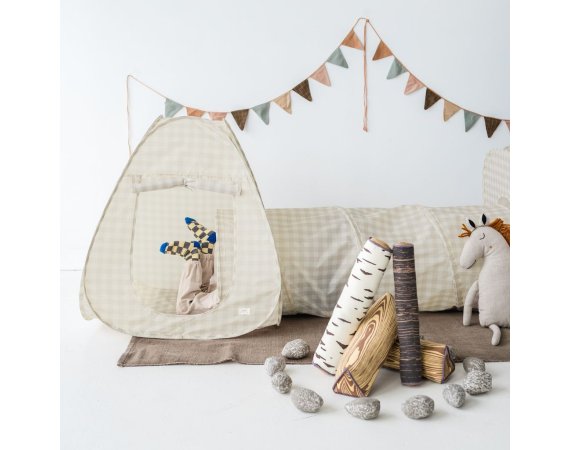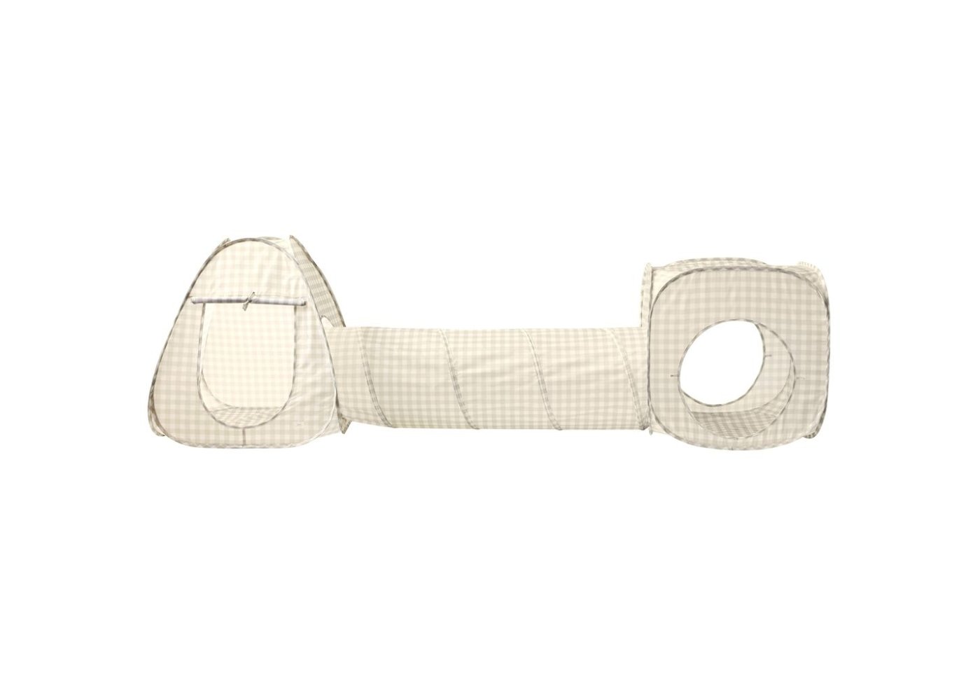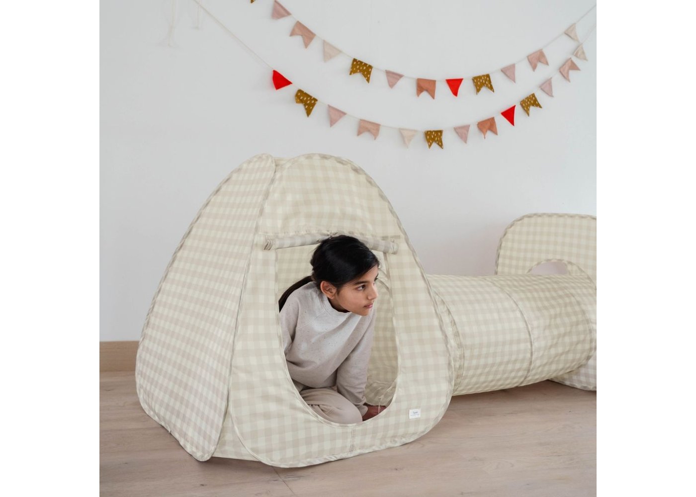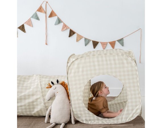 Här kan barnen bygga sin egen lilla grotta, krypa genom tunneln och gömma sig i de två tälten.