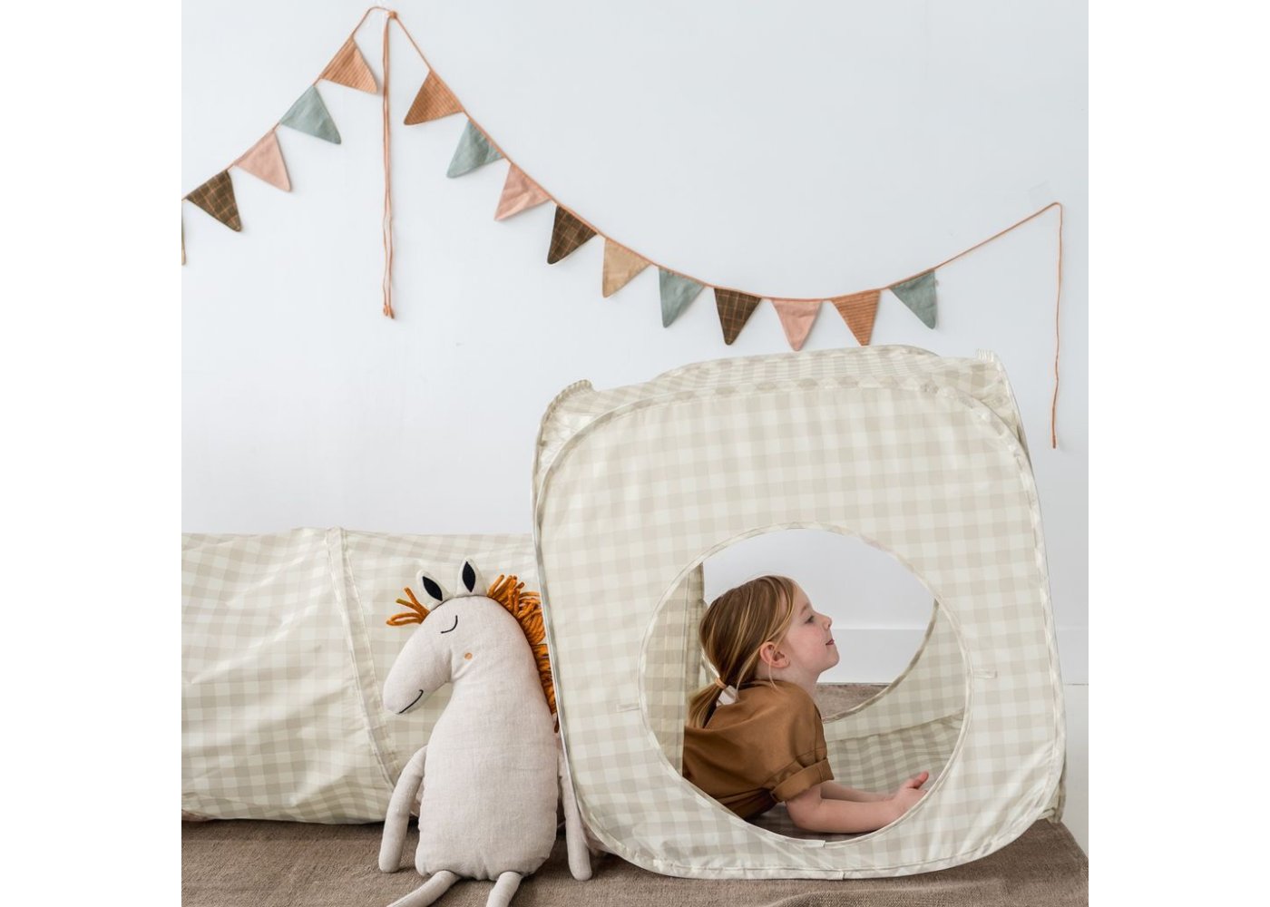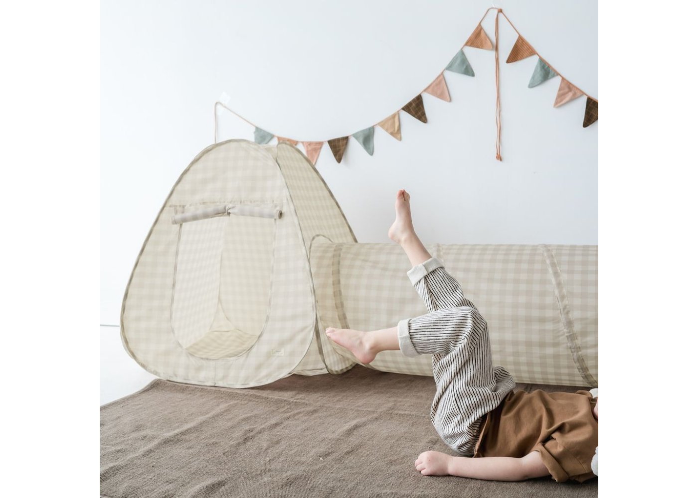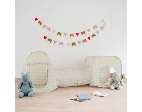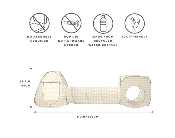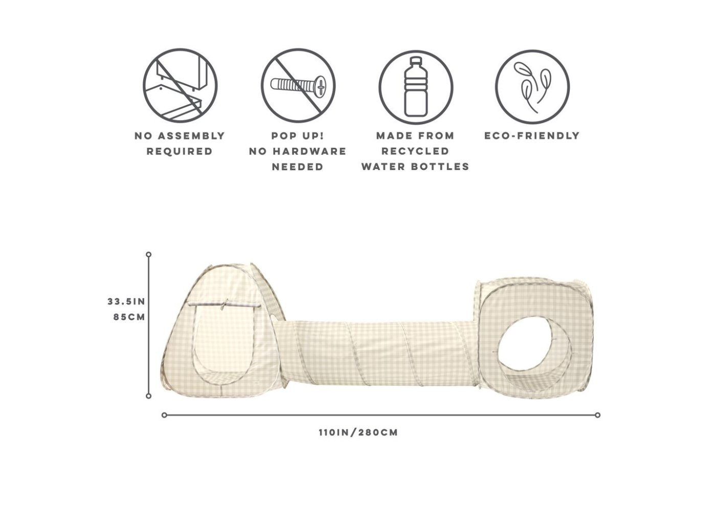 Här kan barnen bygga sin egen lilla grotta, krypa genom tunneln och gömma sig i de två tälten.