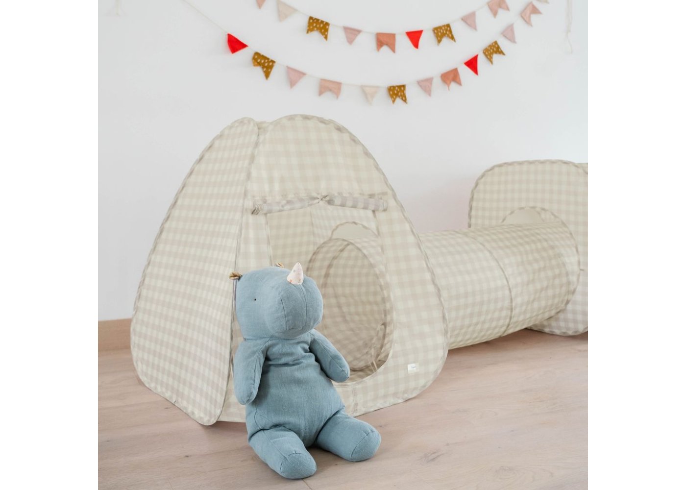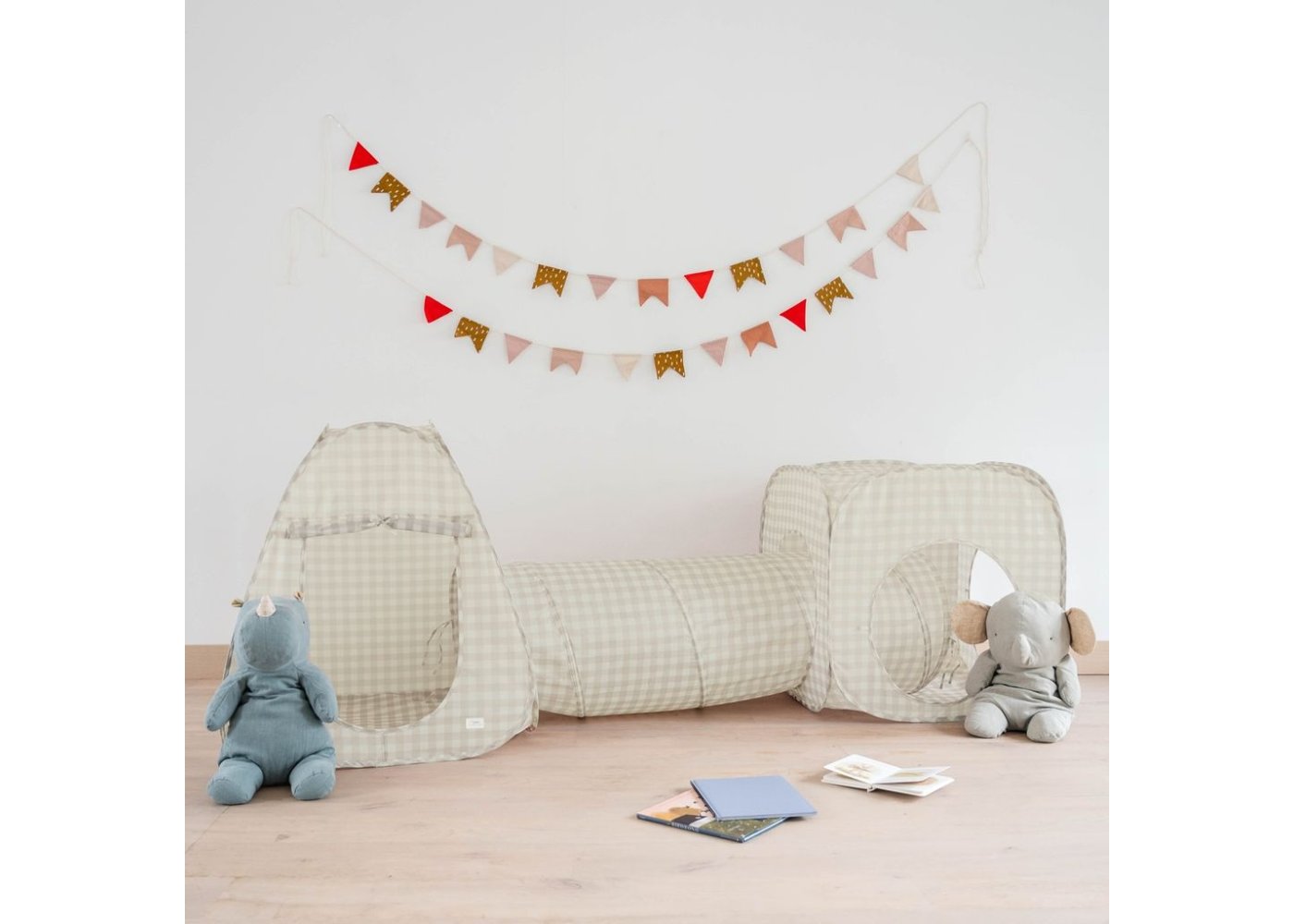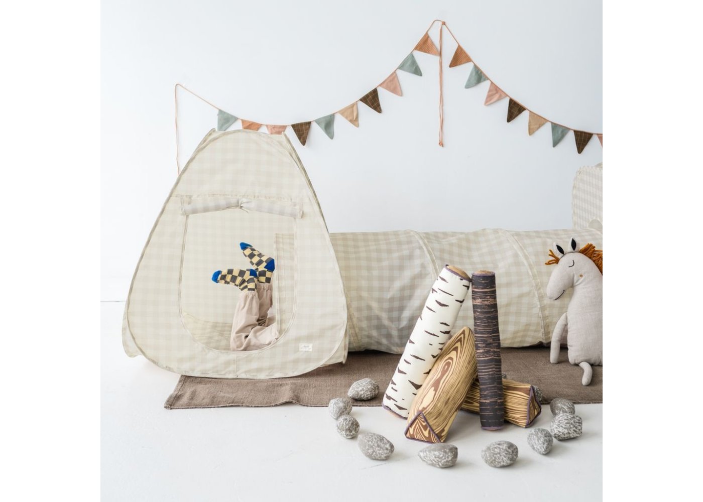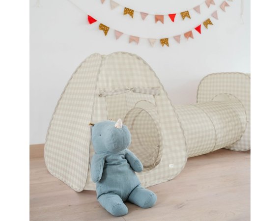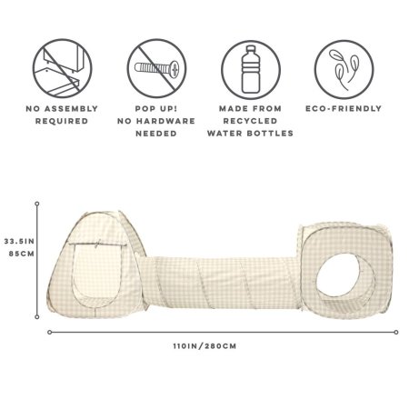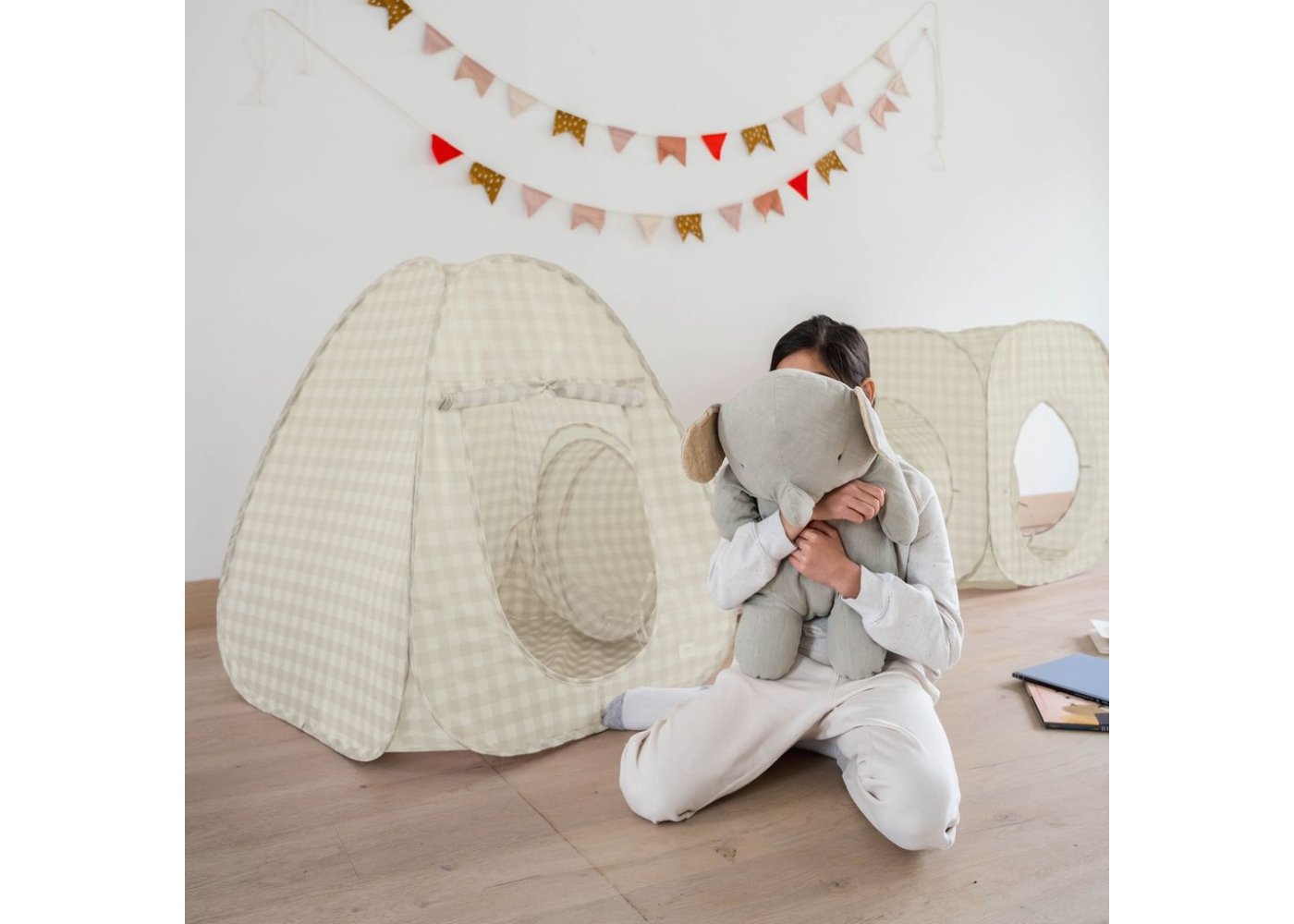 Här kan barnen bygga sin egen lilla grotta, krypa genom tunneln och gömma sig i de två tälten.