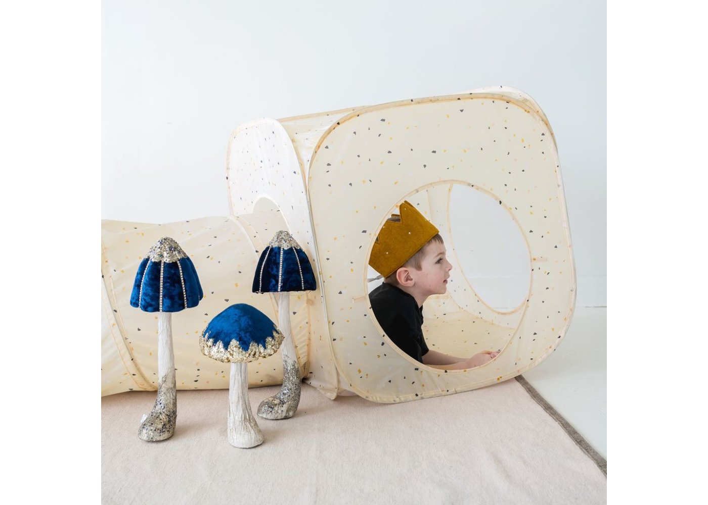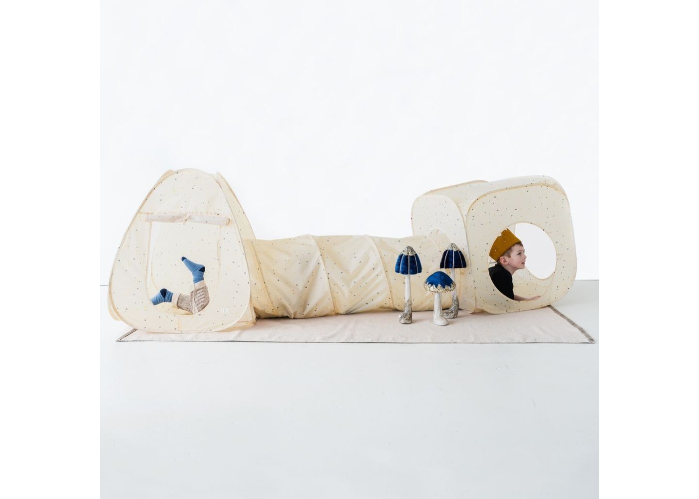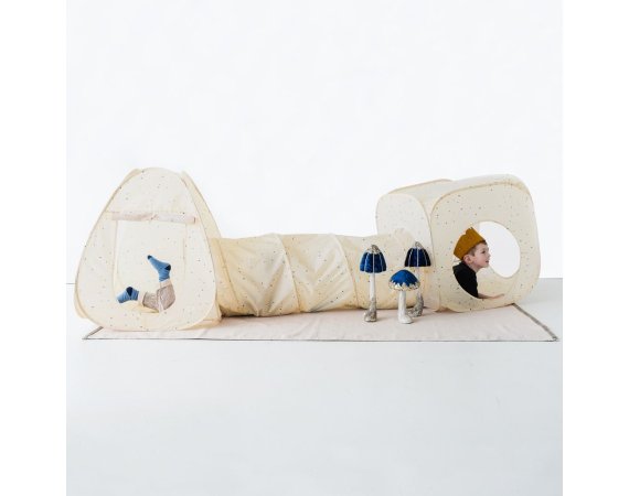 Här kan barnen bygga sin egen lilla grotta, krypa genom tunneln och gömma sig i de två tälten.