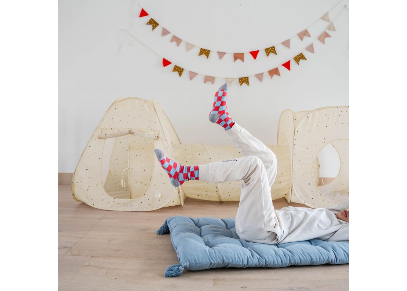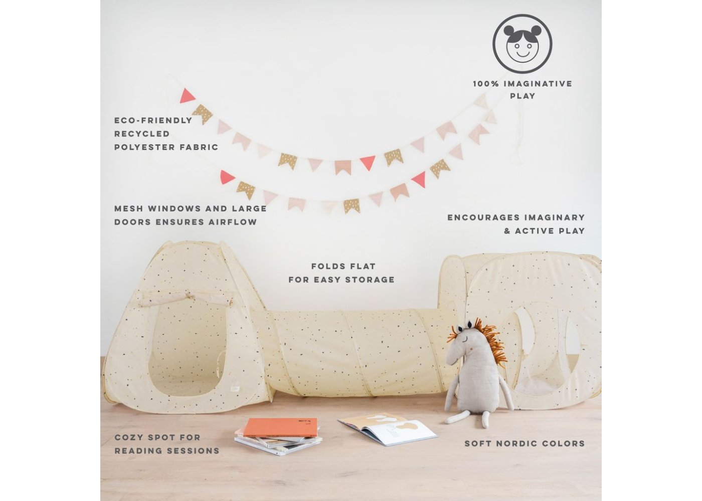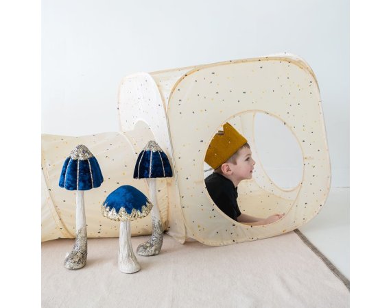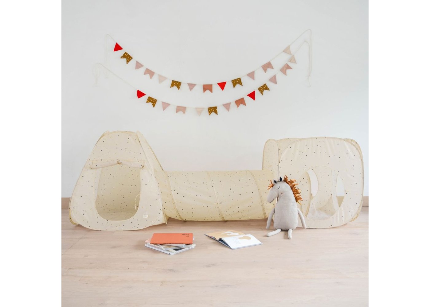 Här kan barnen bygga sin egen lilla grotta, krypa genom tunneln och gömma sig i de två tälten.